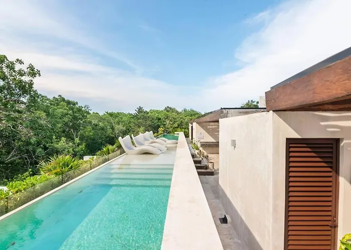 Offering a rooftop swimming pool and a terrace, the spacious Bajocielo107 Lux 2Br Condo Priv Pool In Aldea Zama Tulum is situated in the Zama district, 5 minutes' drive from the national park "Parque Nacional de Tulum". Guests can make use of Wi-Fi for both business and leisure purposes.